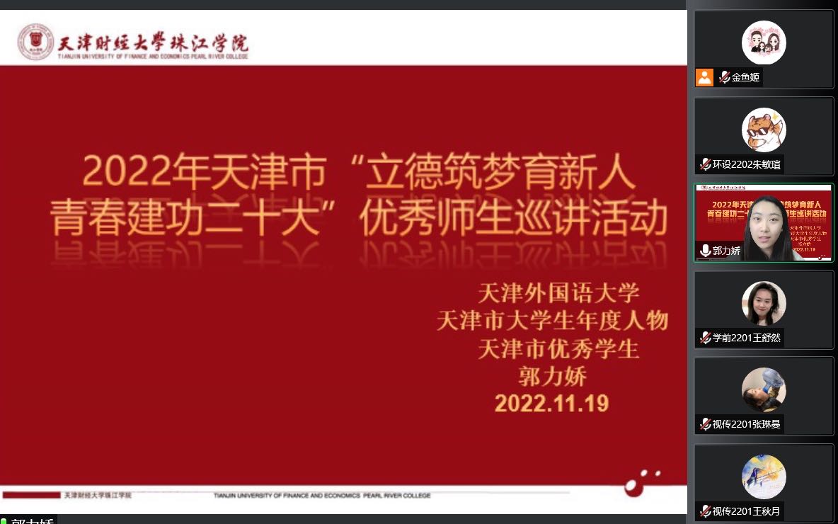 11月19日下午,由市教育两委主办的2022年天津市“立德筑梦育新人 青春建功二十大”优秀师生巡讲活动在我院以线上形式开展。2021年天津市十佳辅导员、天津财经大学商学院团委书记马建伟老师,2021年天津市大学生年度人物、天津外国语大学2019级本科生郭力娇同学受邀主讲。我院全体辅导员、300名学生代表线上聆听了讲座。
