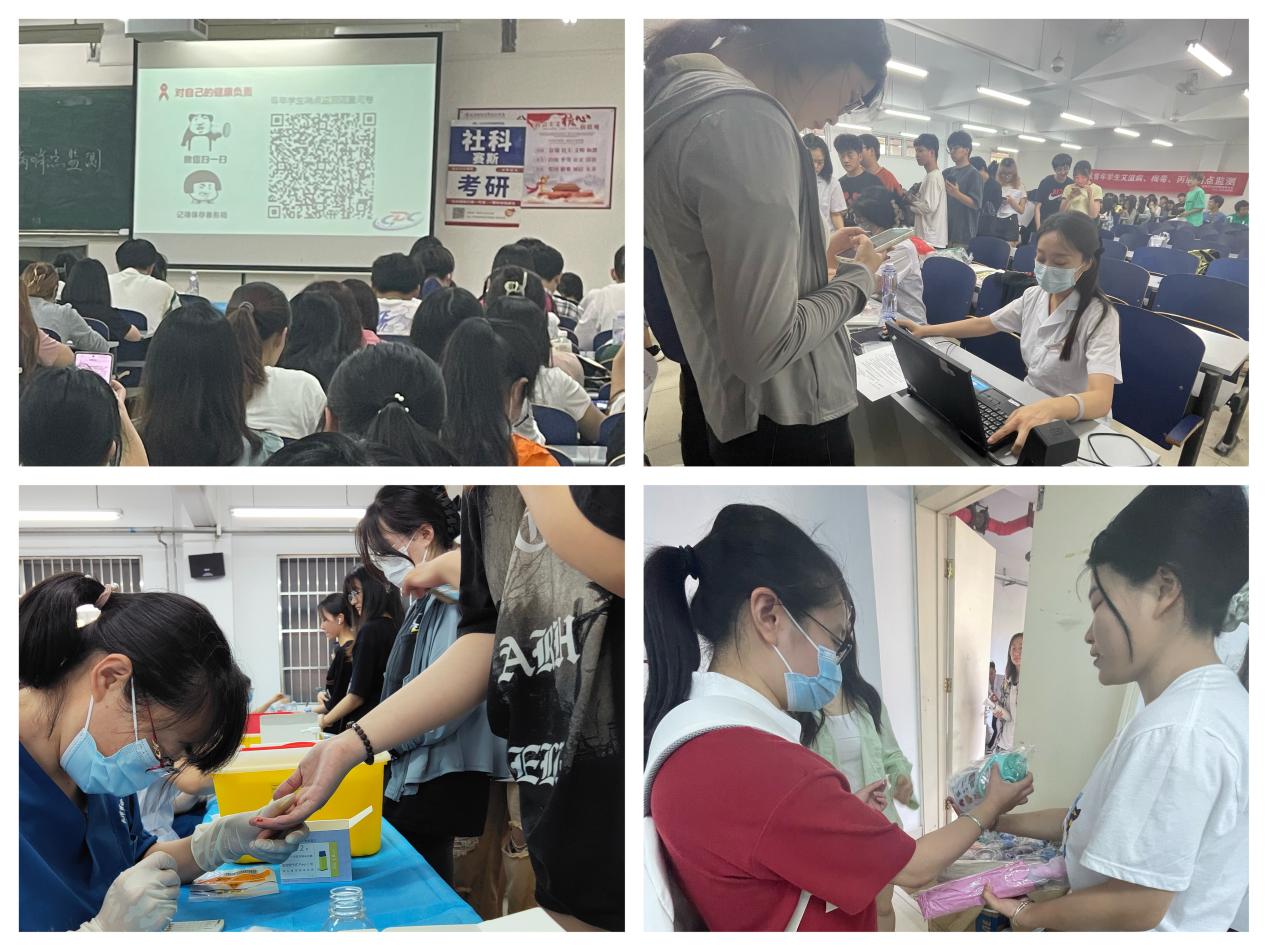 本次活动分为两个部分,第一个部分是预防艾滋病宣传。刘春长科长讲解了预防艾滋病重要性,纪玉环医生介绍了预防艾滋病相关的知识,并播放了预防艾滋病宣传视频。第二部分是组织学生采血筛查,活动流程为:扫二维码填写调查问卷、扫描条形码进行现场登记、按顺序排队采指血,领取活动礼品。现场学生表示受益匪浅,提高了他们对预防艾滋病相关知识的了解和掌握程度。