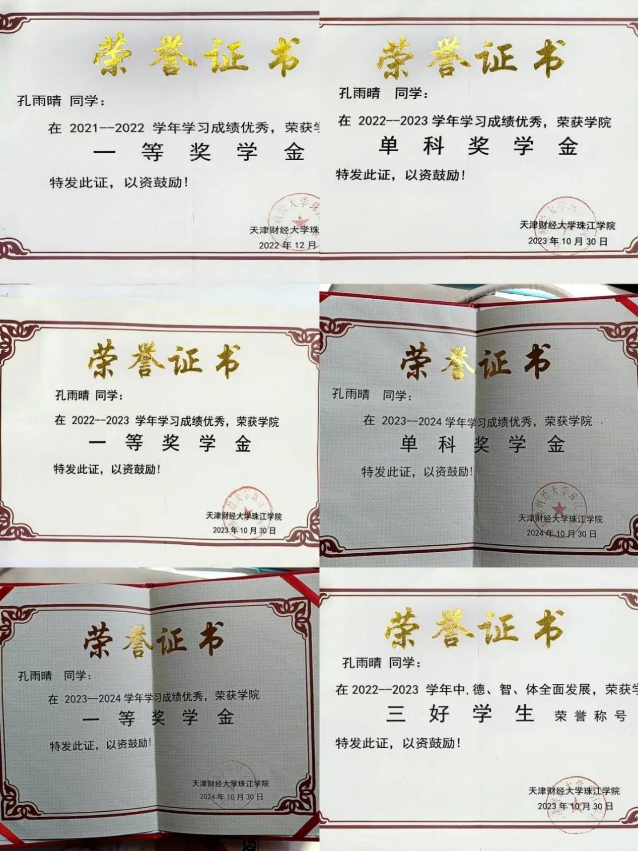 在学业方面孔雨晴始终以高度的自律和刻苦精神投入学习,学业成绩稳居前列。她连续三年获得校一等奖学金,连续两年摘得单科奖学金,绩点位列专业前茅。在语言能力和专业技能提升方面,她通过英语四六级考试,并考取初级会计职称、计算机二级、普通话等资格证书。除此之外,在校期间她还积极参与学科竞赛,展现出她优秀的团队协作能力和进取精神。其中她作为核心成员参与的国家级、省级比赛项目都屡获佳绩,既凸显了专业实力,也印证了她在团队中的领导力。其竞赛成果多次获得权威认可,充分展现了创新实践的综合素养。