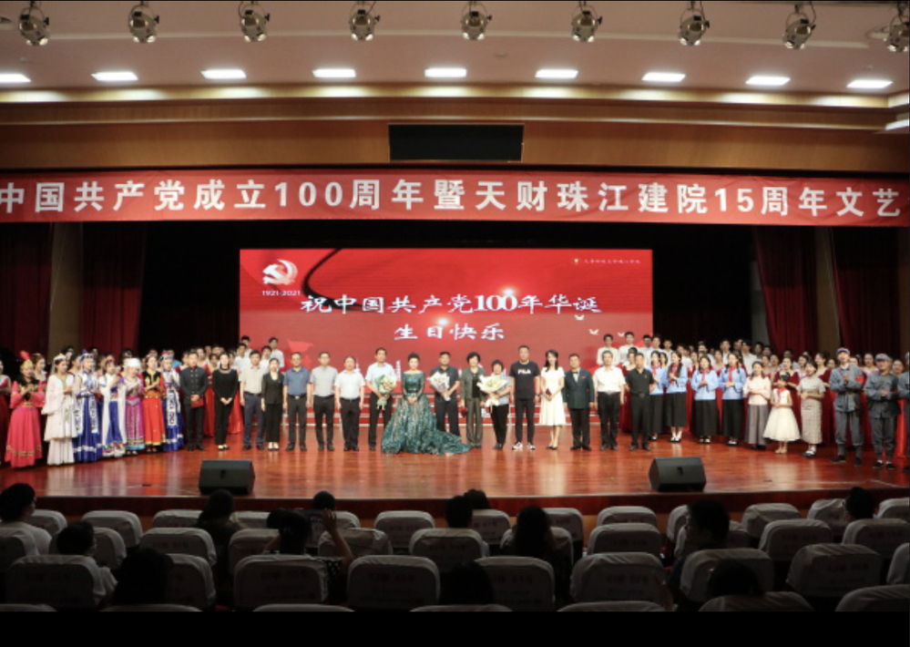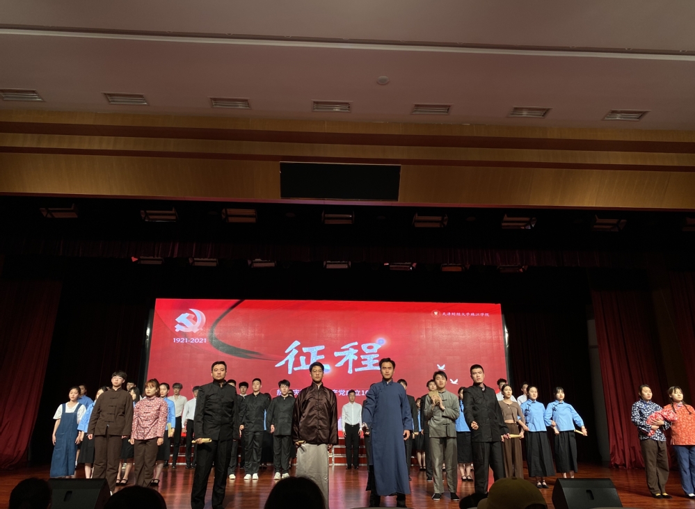 演出共分星火、征程、起航与复兴四个主题板块。演员们身着五四时期服装,以表演与合唱相结合的形式,在一曲热情洋溢的《毕业歌》与庄重严肃的《国际歌》中回忆建党过程;通过朗诵、表演及舞台剧等多种形式,再现了“长征”过程中过雪山草地的艰难、共产党人在《红色家书》展现了赵一曼等革命烈士教导后代的书信;身着各民族服饰的演员齐聚一堂,通过欢快的歌舞形式,在全场观众明快的掌声节拍中,喜悦地唱着《翻身农奴把歌唱》及《唱支山歌给党听》等歌曲,表达着对党的感恩;音乐系丁卉老师演唱一曲《江山》,演出进入“复兴”主题,结合庆祝建党百年,视频回顾了学院15年的发展历程及取得的成就,坚定了全院师生在党的领导下,办好服务社会、人民满意高等教育的信心和决心。管理学院院长张英华教授、科研中心主任张盘铭教授、经济学院王伟老师、数据工程学院赵翠杰老师及经济学院学生党员代表张敬易、石芹六位老、中、青党员代表共同走上舞台,诉说着他们入党不忘初心、砥砺前行的足迹与心声,表达着对党的炽爱和百年华诞的祝福。随后音乐系主任曹鹏飞与丁卉老师共同演唱歌曲《不忘初心》,与全场观众产生了强烈的共鸣。整场演出在我校领导与音乐系全体演出人员共同演唱的《没有共产党就没有新中国》中推向高潮。