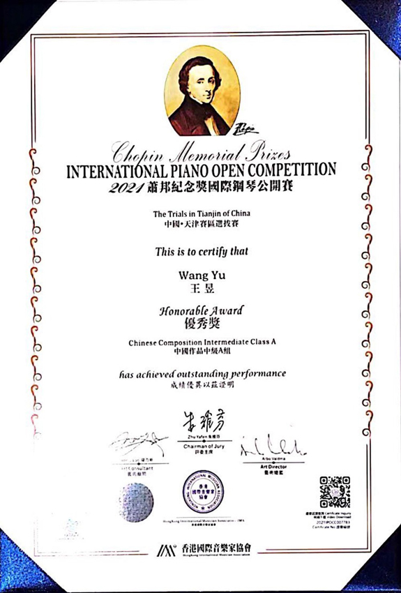 2021肖邦纪念奖国际钢琴公开赛天津赛区优秀奖