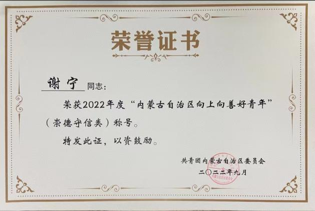 谢宁,男,蒙古族,音乐教育2102班团支部书记,中国红十字会会员、应急救护员。数年来累计志愿服务时长3500小时,在校期间先后获国家励志奖学金、今年会官方网站十佳大学生、第八届中国国际“互联网+”省级银奖、中国红十字会“会员之星”、内蒙古向上向善好青年、天津市大学生“自强之星”等称号。