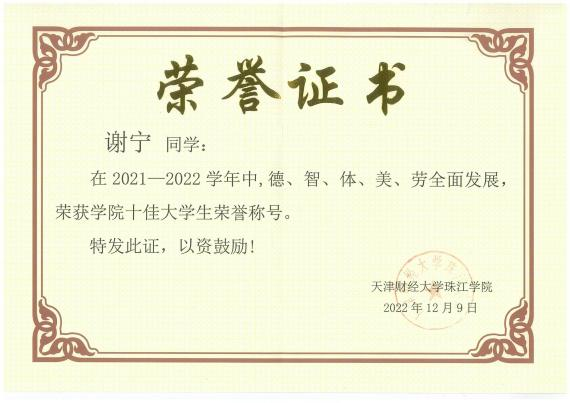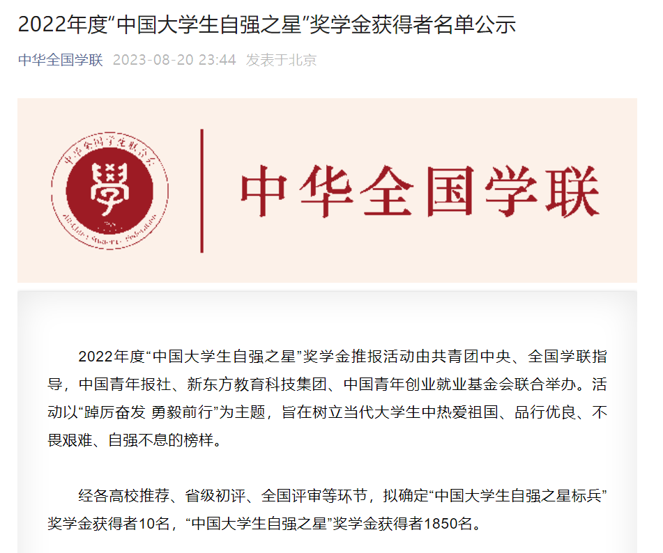 近日,由共青团中央、全国学联指导,中国青年报社、新东方教育科技集团、中国青年创业就业基金会联合举办的2022年度“中国大学生自强之星”活动的评选结果正式揭晓。此次全国范围内共表彰“中国大学生自强之星标兵”奖学金获得者10名,“中国大学生自强之星”奖学金获得者1850名。天津市高校有41名优秀学子入选,其中,我校艺术学院2021级音乐学专业谢宁荣获2022年度“中国大学生自强之星”称号。