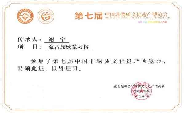 非物质文化遗产是指各族人民世代相传并视为其文化遗产组成部分的各种传统文化表现形式,以及与传统文化表现形式相关的实物和场所。2022年8月谢宁受邀参加第七届中国非物质文化遗产博览会,作为代表展示《蒙古族饮茶习俗》项目,荣登中央广播电视总台《文化十分》栏目。