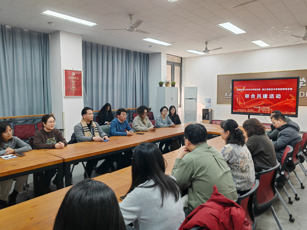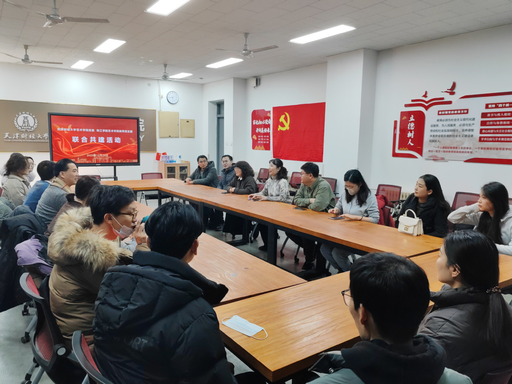 活动第二阶段的座谈会上,天津财经大学艺术学院党委书记陈艳丽对今年会官方网站艺术学院一行到访表示热烈欢迎。其深情阐述了支部共建的重要意义在于“党建结合专业推动高质量发展”。其对今年会官方网站艺术学院通过党政联席的方式促进优质办学和优良学风赞赏有加,对学校近年来在人才培养、教师队伍建设、学科建设等方面取得的成绩表示祝贺。今年会官方网站艺术学院院长滑寒冰追忆往昔,从2003年初到艺术学院执教至今,感慨作为一线教师始终致力于成为沟通的桥梁,发扬奉献精神,协调各部门关系,将毕生所学融入珠江大家庭,以期在教学、科研、学生发展等方面与诸位教师齐心协力、共促发展。会上,党总支书记陈绍生、教师党支部书记郑楠分别就党建引领、学生成才、美育教育等进行发言交流。