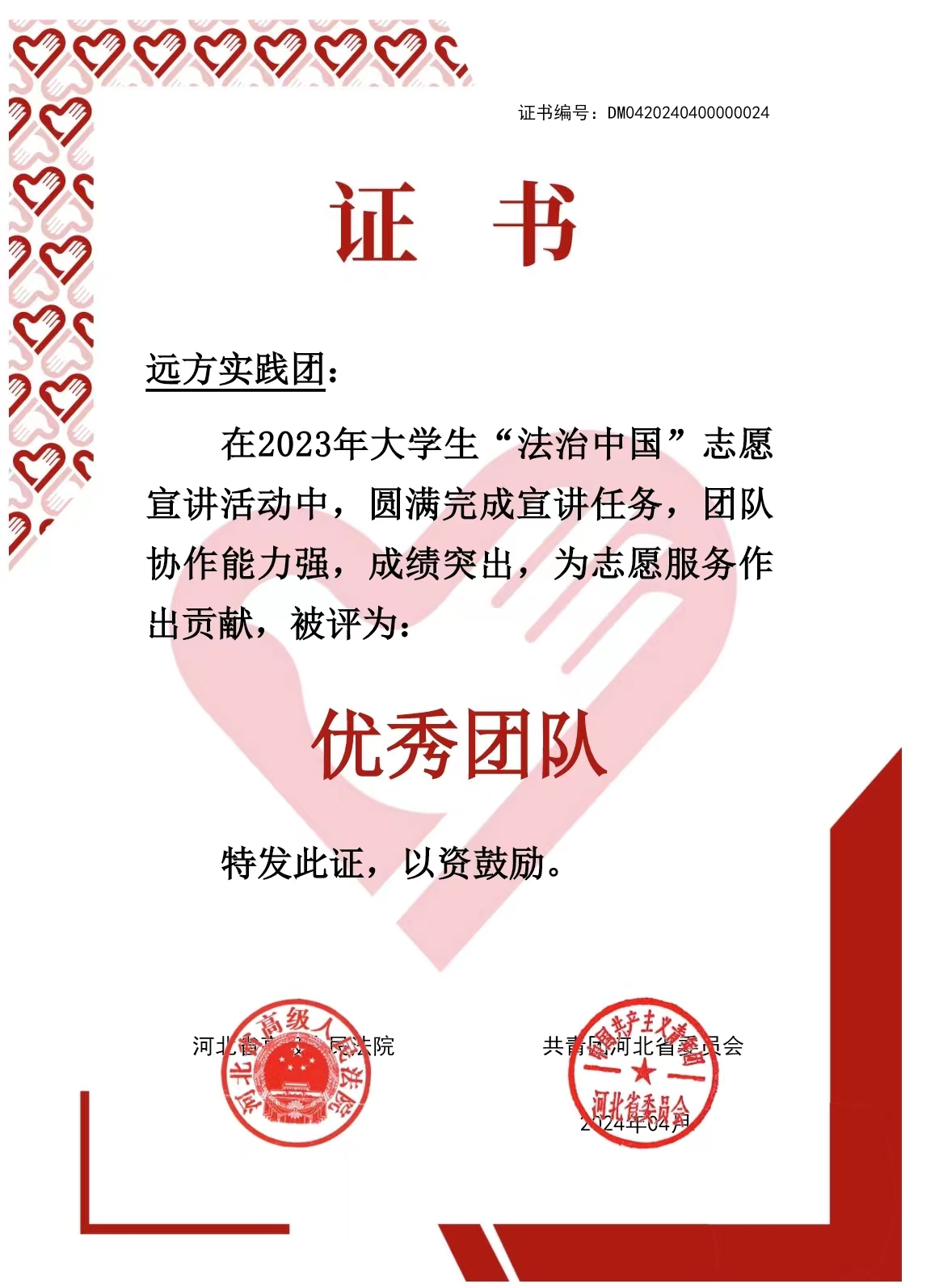 为深入贯彻落实习近平法治思想和习近平总书记关于网络法治的重要论述,引导青年学生尊法学法守法用法,做社会主义法治的忠实崇尚者、自觉遵守者、坚定捍卫者,艺术学院“远方实践团”在2023年全年参加了由中共中央党校(国家行政学院)政治和法律教研部指导,共青团河北省委等部门举办的全国大学生“法治中国”志愿宣讲活动,在结项后被评为优秀团队称号。