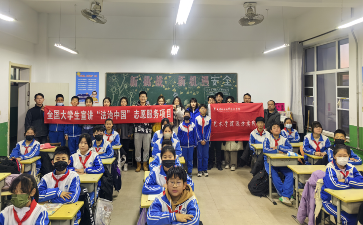 在集中实践学习后,团队结合实践学习收获,围绕法治理论宣讲、法律知识普及等内容,以走访中小学的形式开展主题宣讲。12月20日,艺术学院党总支书记、学工办主任陈绍生和学生党支部王琳维老师带领艺术学院“远方实践团”来到大唐庄镇初级中学开展了志愿服务。