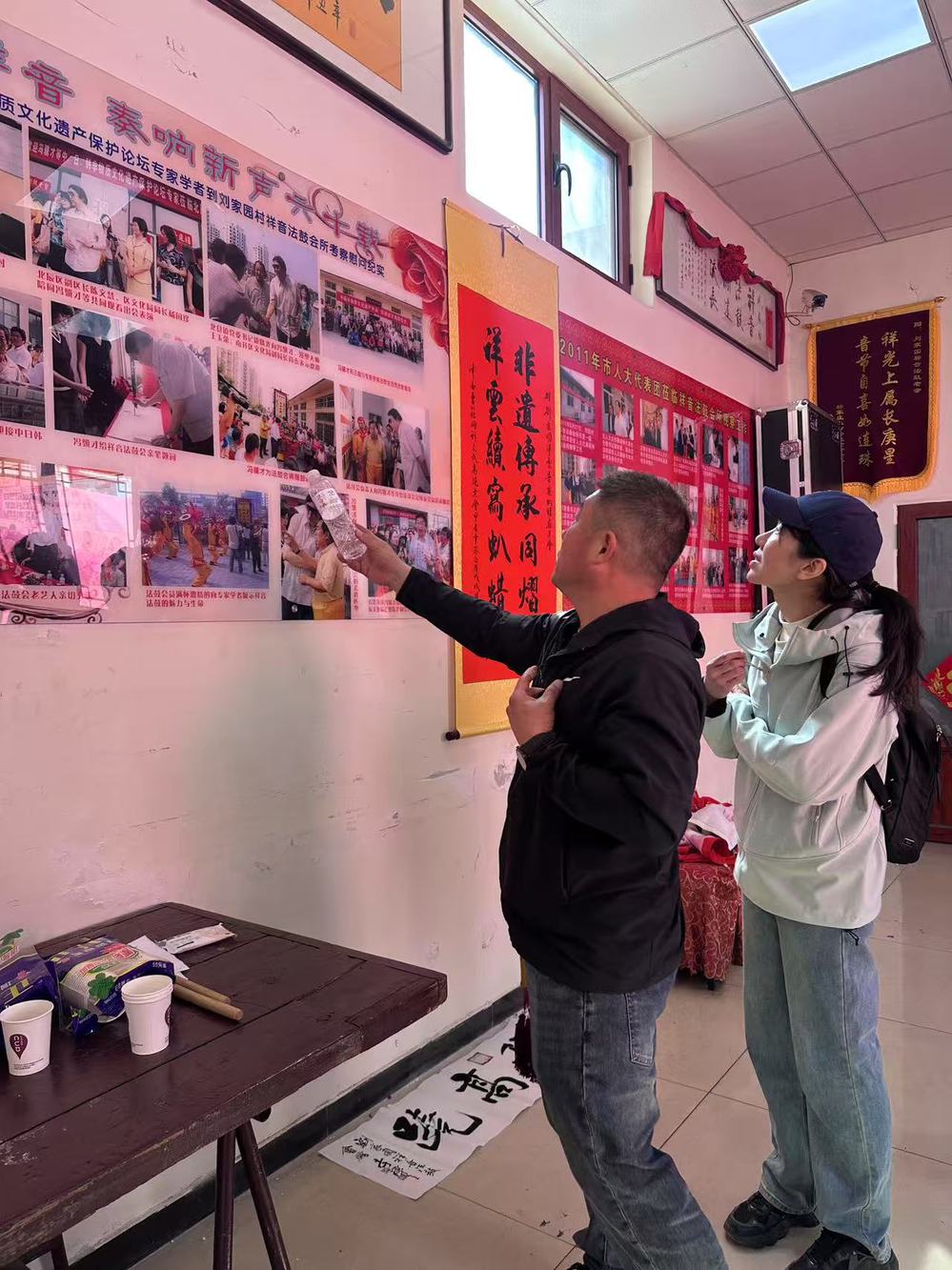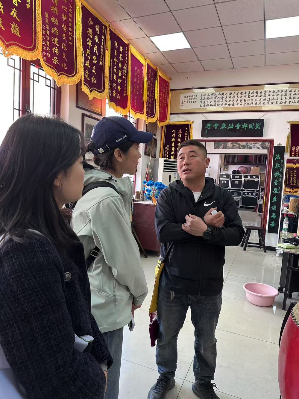 调研期间,师生们采访了各老会会长及艺人,深入了解非遗传承现状及其面临的挑战。师生们参观了祥音法鼓传习所,法鼓会长王旭老师为师生介绍了法鼓乐器、銮驾等出巡道具,并讲解了老会的历史、鼓谱的记谱方式等知识。刘园祥音法鼓作为国家级非遗,以其独特的鼓乐节奏和表演形式,展现了津派非遗音乐的深厚底蕴。