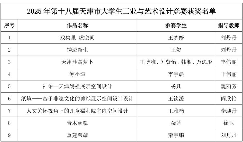 近日,2025年6月由天津市教委主办、天津商业大学承办、天津轻工职业技术学院协办的“第十八届天津市大学生工业与艺术设计竞赛”获奖名单正式公布。艺术学院学生表现出色,共荣获9个奖项,其中包括二等奖2项、三等奖7项。