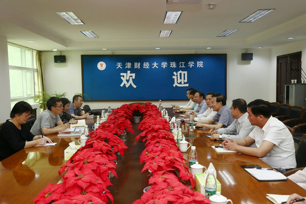 2019年5月24日,天津财经大学党委书记张亚、党校办主任朱国华、组织部部长周艳萍、发展战略研究室主任杨东一行四人来院调研指导。高正平院长汇报学院工作,院领导班子成员、部分部门负责人出席会议。