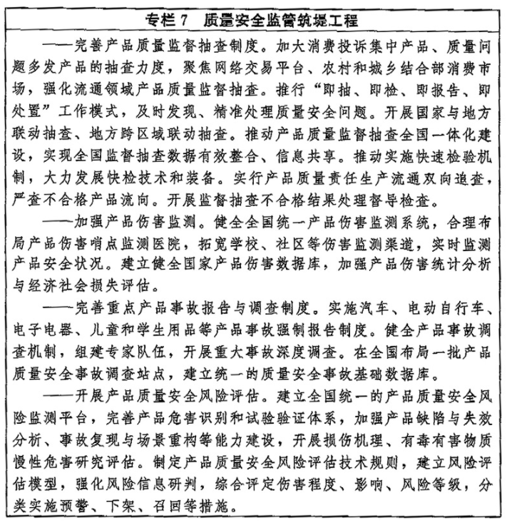 (二十七)优化质量监管效能。健全以“双随机、一公开”监管和“互联网+监管”为基本手段、以重点监管为补充、以信用监管为基础的新型监管机制。创新质量监管方式,完善市场准入制度,深化工业产品生产许可证和强制性认证制度改革,分类放宽一般工业产品和服务业准入限制,强化事前事中事后全链条监管。对涉及人民群众身体健康和生命财产安全、公共安全、生态环境安全的产品以及重点服务领域,依法实施严格监管。完善产品质量监督抽查制度,加强工业品和消费品质量监督检查,推动实现生产流通、线上线下一体化抽查,探索建立全国联动抽查机制,对重点产品实施全国企业抽查全覆盖,强化监督抽查结果处理。建立健全产品质量安全风险监控机制,完善产品伤害监测体系,开展质量安全风险识别、评估和处置。建立健全产品质量安全事故强制报告制度,开展重大质量安全事故调查与处理。健全产品召回管理体制机制,加强召回技术支撑,强化缺陷产品召回管理。构建重点产品质量安全追溯体系,完善质量安全追溯标准,加强数据开放共享,形成来源可查、去向可追、责任可究的质量安全追溯链条。加强产品防伪监督管理。建立质量安全“沙盒监管”制度,为新产品新业态发展提供容错纠错空间。加强市场秩序综合治理,营造公平竞争的市场环境,促进质量竞争、优胜劣汰。严格进出口商品质量安全检验监管,持续完善进出口商品质量安全风险预警和快速反应监管机制。加大对城乡结合部、农村等重点区域假冒伪劣的打击力度。强化网络平台销售商品质量监管,健全跨地区跨行业监管协调联动机制,推进线上线下一体化监管。