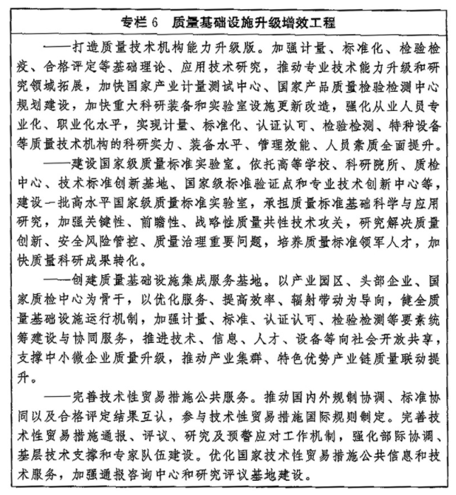 ——质量基础设施更加现代高效。质量基础设施管理体制机制更加健全、布局更加合理,计量、标准、认证认可、检验检测等实现更高水平协同发展,建成若干国家级质量标准实验室,打造一批高效实用的质量基础设施集成服务基地。
