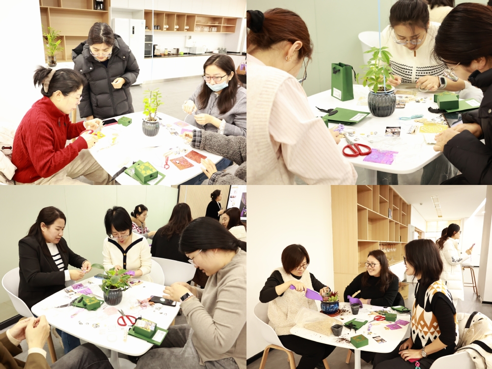在多肉盆景区,女教职工们瞬间化身为“巧手园丁”。在专业老师的讲解下,大家手持小铲,填土、栽种、铺面、装饰,一土一铲都倾注着对生活的热爱。而在宋锦挂饰区,则是一场关于耐心与细致的考验。在专业老师的悉心指导下,大家修剪、粘贴、折叠、定型,原本零散的布料逐渐幻化成一匹匹憨态可掬、神气活现的“小马”挂饰。一拼一接都融入了对美好生活的期许,也在一剪一琢中感受到了非遗文化的独特魅力。