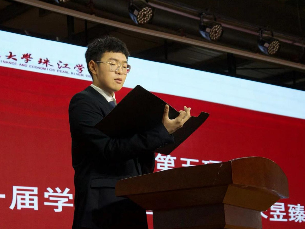 大会第三项,学生会主席米昱臻代表全体学生会成员发言。米昱臻同学介绍了新学年的工作计划,同时他在发言中也提到,未来一年他将带领学生会努力做到:一是平衡学习与工作,用真学问,真本领,体悟书中真理力量,践行学生会为同学服务的初心使命;二是心怀理想,肩负责任,树立大局意识,在学习、生活、工作中做好带头模范作用。三是保持礼貌谦卑,尊重师长,行于礼,言于合,展现会计学院风采。