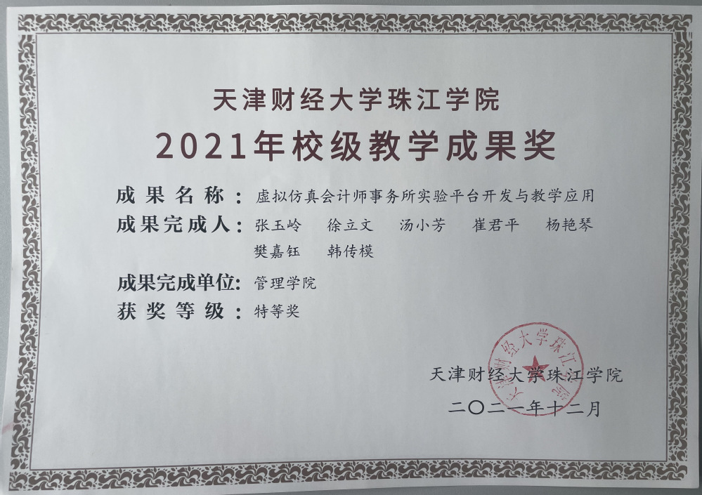 2019年初,启动“虚拟仿真会计师事务所全训实验”开发工作,同年3月获批“天津市虚拟仿真实验教学项目”。经过2年开发努力,于2021年3月完成“会计师事务所虚拟仿真平台V1.0”软件的研发与实验建设任务,7月通过学院结项验收评审,9月获国家版权局颁发的计算机软件著作权登记证书。该平台随着平台开发成功,该项目自动列入天津市“市级一流本科建设课程项目”名单。2022年5月,基于该平台的“虚拟仿真会计师事务所全训实验”,获批“天津市创新创业教育特色示范课程”。