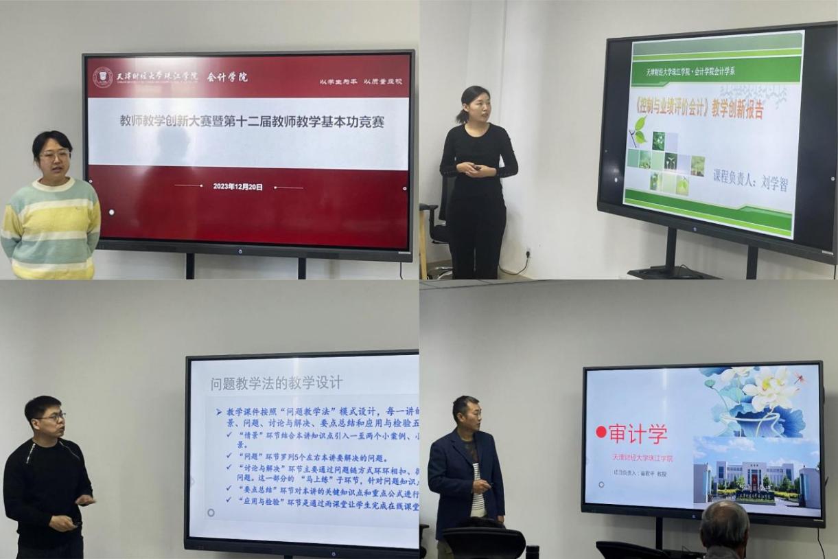 为提高教师的教学水平,激发教育创新活力,12月20日下午,会计学院徐立文老师的名师工作室组织全体教师开展教学创新大练兵活动。经过初选,本次练兵活动推选了12名教师上台比拼,邀请了教学督导专家杨尊琦、赵秀云教授,以及会计学院院长韩传模作为评委专家进行指导。比赛由会计学院办公室主任杨璐主持。