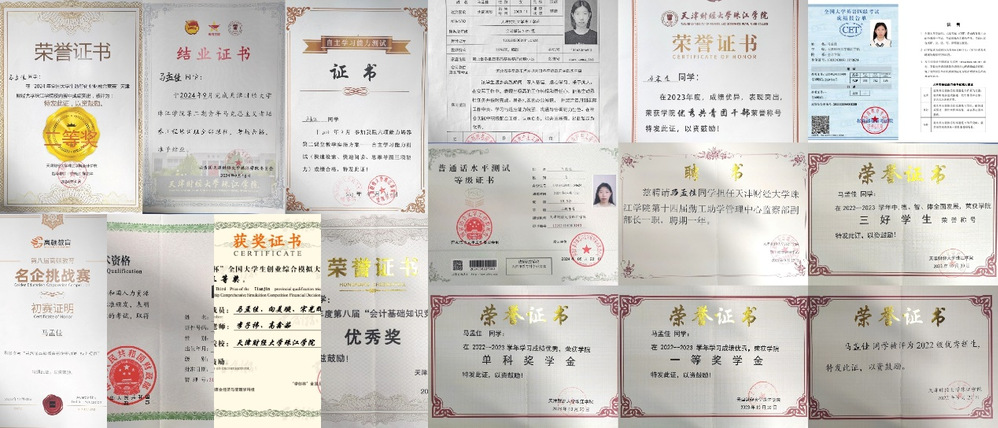 在学习上,她刻苦钻研。在校期间获得一等、二等奖学金、三好学生,一次性通过初级会计考试,银行从业资格考试,取得英语四级证书和普通话二甲证书。她积极参加各类竞赛,获得了第十一届“学创杯”全国大学生创业综合模拟大赛财务决策模拟赛项天津市三等奖、ACCA全国大学生才智精英挑战赛决赛证书等。