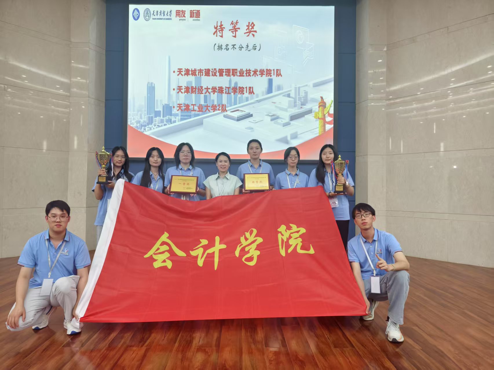 6月7日,第21届全国高等院校数智化企业经营沙盘大赛天津市赛在天津商业大学圆满举行。会计学院两支代表队凭借扎实的专业功底与出色的实践创新能力脱颖而出,一举夺得特等奖(第一名)与一等奖(第三名)。