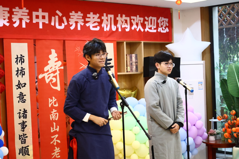 在工作人员协助下,师生文艺节目紧扣“忆英雄,暖重阳”主题登场。秦腔现代戏《血泪仇》字字铿锵,以经典旋律和厚重腔调唤醒岁月中的家国记忆;相声《红色精神“新说”》以幽默风趣的语言的形式,将红色精神与时代故事相结合,在阵阵笑声中传递正能量,展现出红色内涵的新活力;诗朗诵《总有一天》声情并茂,朗诵者用真挚的情感、激昂的语调,诉说着对英雄的敬仰、对未来的期许,引发全场共鸣。当《我的中国心》的旋律缓缓响起,师生与老人们共同挥动手中的小红旗,齐声合唱,爱国情怀与民族自豪感在每个人的心中悄然升腾。