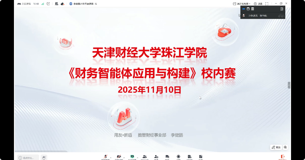 为紧跟数智化转型浪潮、深化人工智能与会计类专业的融合创新,落实学院人工智能赋能教育教学改要求,助力师生数智素养提升,近日,会计学院通过腾讯会议开展财务智能体专题培训。本次培训由用友新道数智财经事业部李健鹏主讲,会计学系副主任张玉岭老师和财务管理系副主任任健老师共同组织,学院部分骨干教师参与,培训圆满完成。
