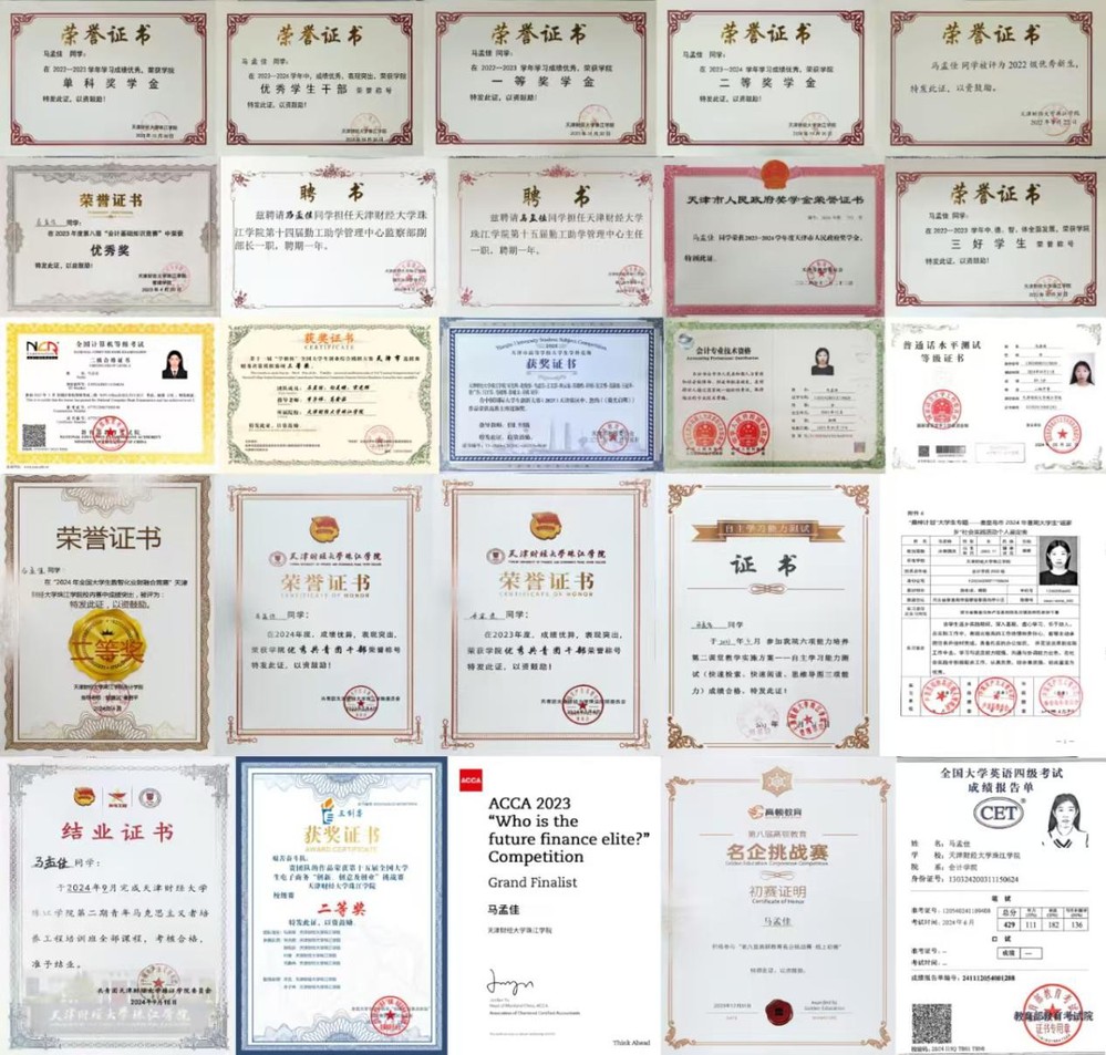 在学习上,她刻苦钻研。在校期间多次获得奖学金、三好学生等荣誉,一次性通过初级会计考试,银行从业资格考试,取得英语四级证书和计算机二级证书。她积极参加各类竞赛,获得了第十一届“学创杯”全国大学生创业综合模拟大赛财务决策模拟赛项天津市三等奖、2025中国国际大学生创新大赛天津市铜奖等。