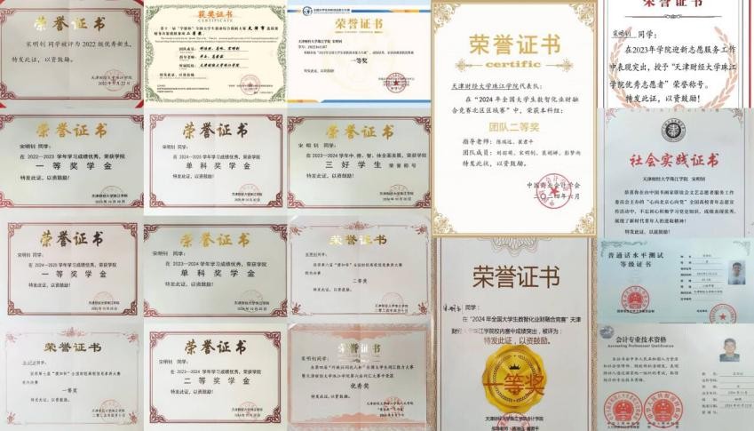 在学习中,他专注投入和深度钻研。在校期间获得一等、二等、单科奖学金、三好学生,一次性通过初级会计考试和普通话证书。他还积极参与各类竞赛,获得了全国大学生数智化业财融合二等奖和第十一届“学创杯”全国大学生创业综合模拟大赛财务决策模拟赛项天津市二等奖等。