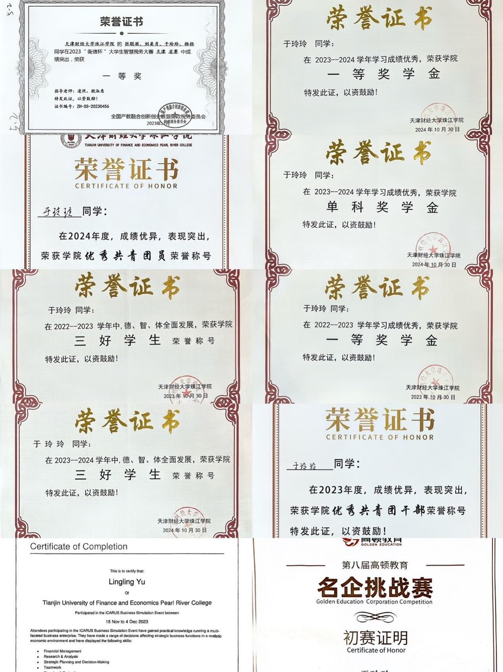 在学业领域,于玲玲始终秉持脚踏实地的态度,连续三年获评学院一等奖学金和学院三好学生荣誉称号,连续两年斩学院单科奖学金,深耕专业知识的同时,充分利用课余时间拓宽认知边界,不断充实自我。凭借不懈努力,已成功考取大学英语四级、普通话、计算机二级以及初级会计等多项证书,展现出扎实的专业功底与全面的能力素养。此外,还踊跃投身各类学科竞赛,参加全国“衡信杯”大赛,荣获天津市一等奖,参加ACCA全国大学生财智精英挑战大赛,成功入围决赛,积极参加高顿教育名企挑战赛,在实践中打磨技能、积累经验,为个人成长增添了生动注脚。