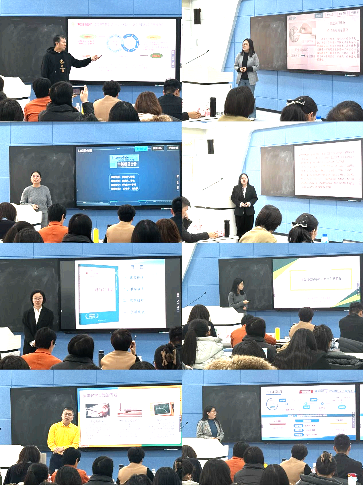 八位主讲教师代表课程团队,紧扣教学实践痛点,围绕课程内容重构、教学方法革新、课程思政融入、评价机制优化、产教协同育人及数智技术赋能等方面,系统汇报了教学改革的探索路径与实践成果,充分展现了扎实的教学创新能力和前瞻性的育人理念。