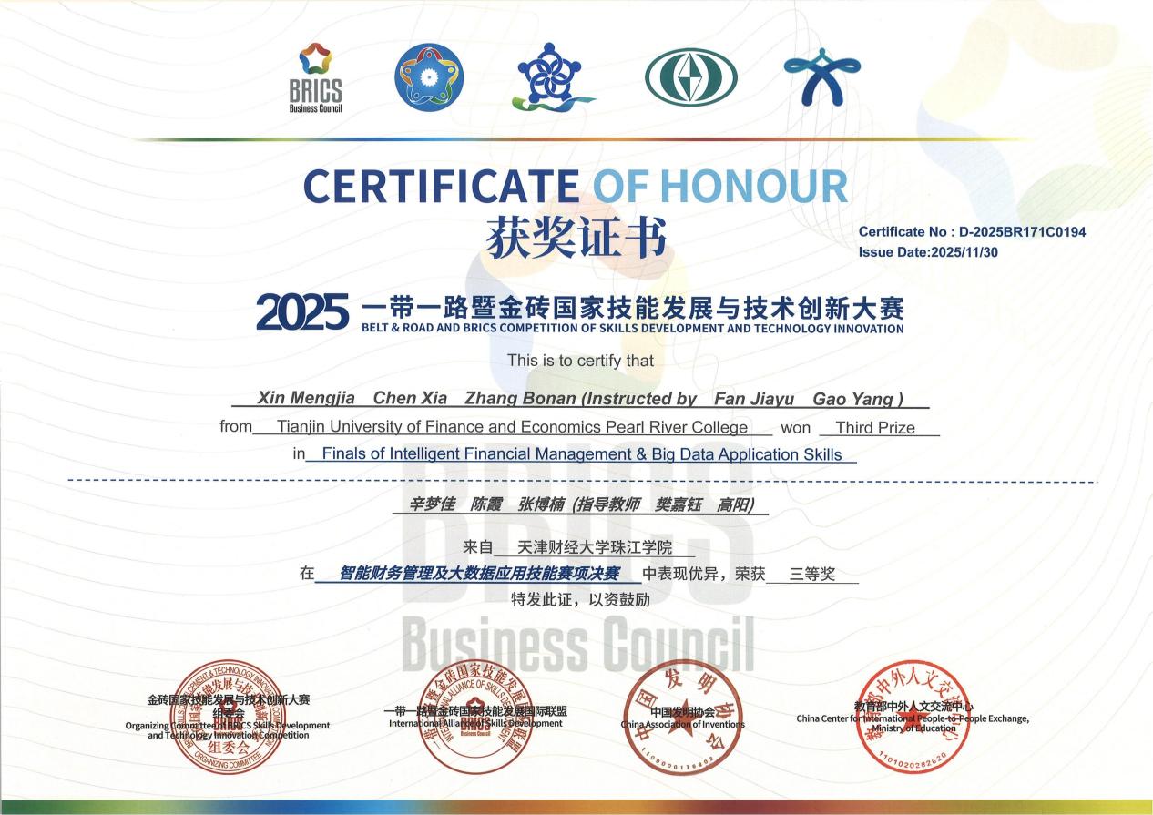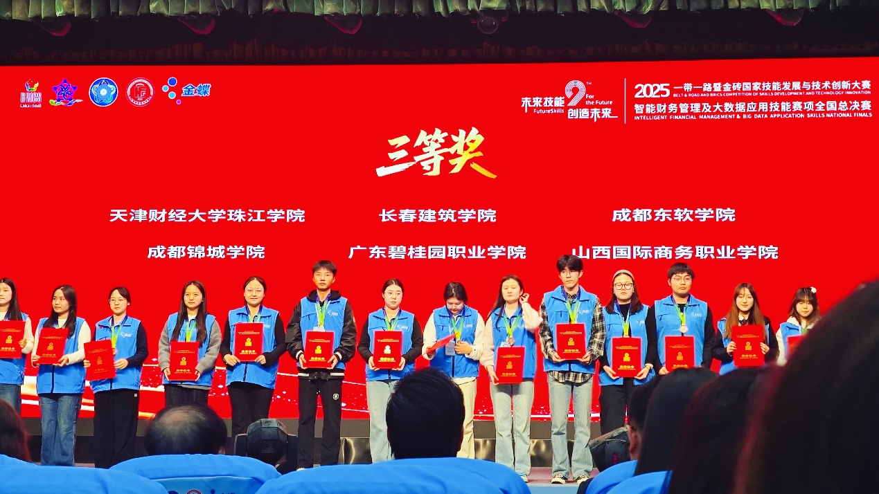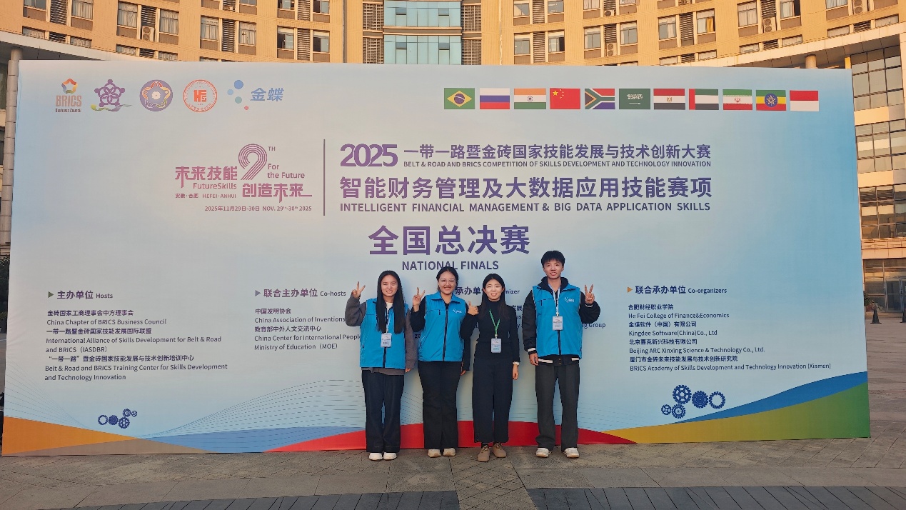 近日,2025“一带一路”暨金砖国家技能发展与技术创新大赛之智能财务管理及大数据应用技能赛项全国总决赛在合肥财经职业学院圆满落幕,由会计2409班辛梦佳、会计2317班陈霞和审计2304班张博楠组成的参赛代表队,在樊嘉钰、高阳两位老师的悉心指导下,经过激烈角逐和层层筛选,最终荣获全国三等奖。