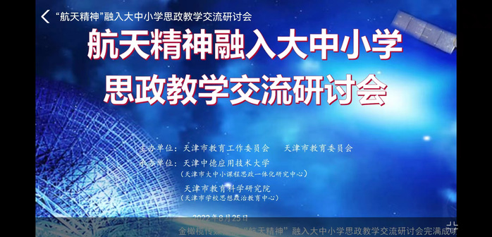 2022年8月25日,由天津市教育工委、天津市教委主办的“航天精神”融入大中小学思政教学交流研讨会顺利召开。此次会议在中国空间技术研究院天津基地“筑梦天宫航天精神教育培训基地”举办。我院政治理论课部郑曼、李荣、赵晓娇三位老师参会。