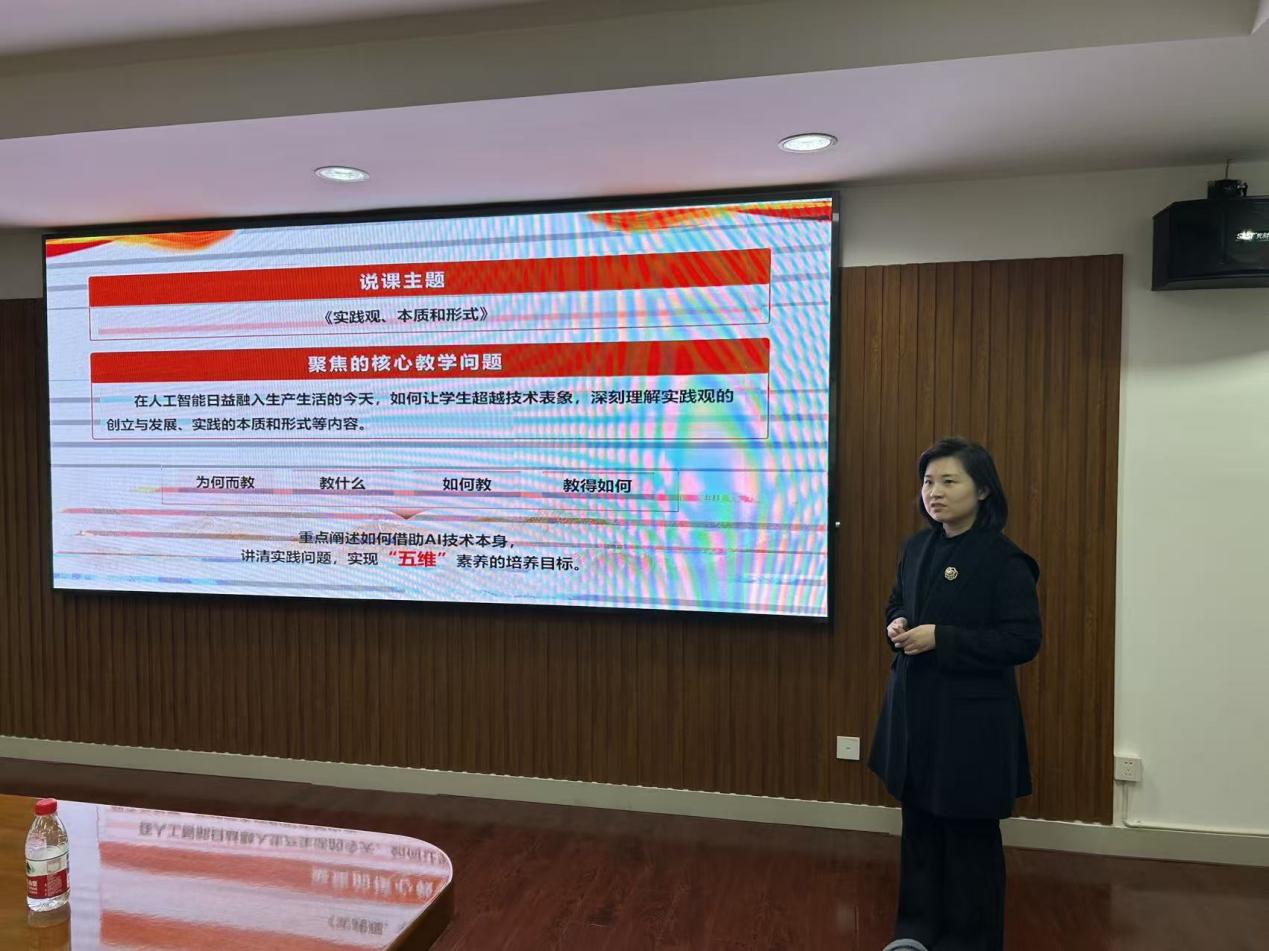 会上,张健老师以“实践观、本质和形式”为主题进行了说课展示,她聚焦核心教学问题,结合学情分析,重点阐述了如何借助AI来实现“五维”素养的培养目标。李可老师以“红歌搭台,实践本质唱出来”为主题进行了授课展示,她以红歌导入的形式将整个教学过程串联起来,阐释了实践的科学内涵和三大基本特征等。